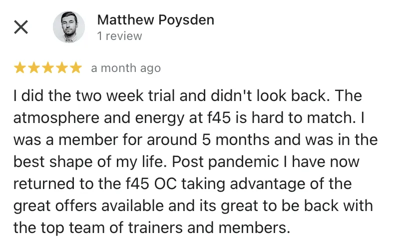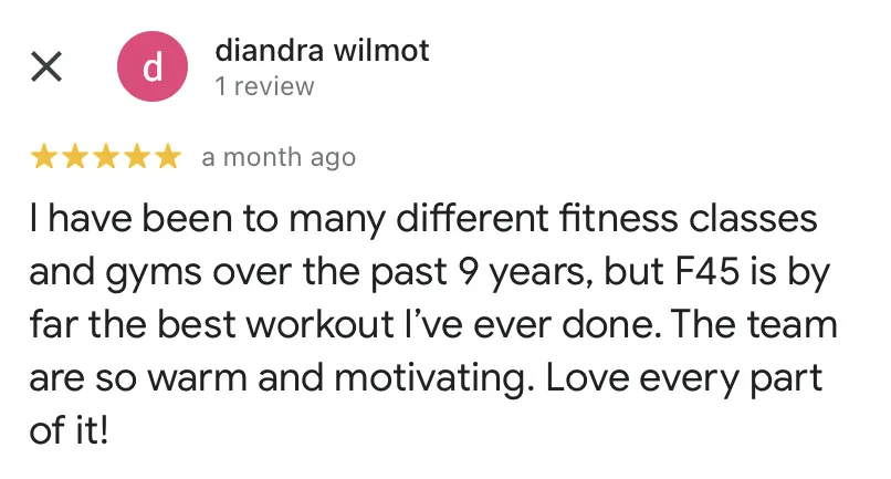 "What makes F45 OC so special is the fact that the coaches as well as the owners treat you like family. You get a sense of community and belonging and it just gives you the extra motivation to get yourself in the studio for these workouts. When it comes to the quality of the workouts themselves - they're insane, but the feeling you get after them is just so worth it!"